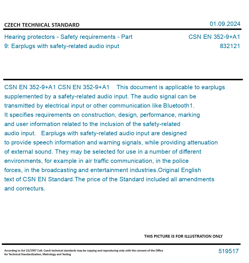 CSN EN 352-9+A1 This document is applicable to earplugs supplemented by a safety-related audio input. The audio signal can be transmitted by electrical input or other communication like Bluetooth1. It specifies requirements on construction, design, performance, marking and user information related to the inclusion of the safety-related audio input. Earplugs with safety-related audio input are designed to provide speech information and warning signals, while providing attenuation of external sound. They may be selected for use in a number of different environments, for example in air traffic communication, in the police forces, in the broadcasting and entertainment industries. Original English text of CSN EN Standard. The price of the Standard included all amendments and correcturs.