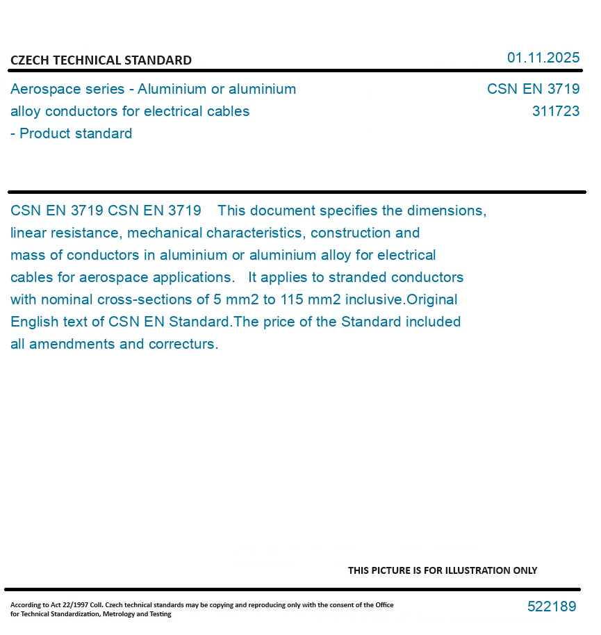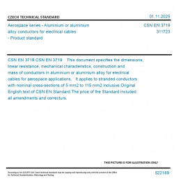 CSN EN 3719 This document specifies the dimensions, linear resistance, mechanical characteristics, construction and mass of conductors in aluminium or aluminium alloy for electrical cables for aerospace applications. It applies to stranded conductors with nominal cross-sections of 5 mm2 to 115 mm2 inclusive. Original English text of CSN EN Standard. The price of the Standard included all amendments and correcturs.