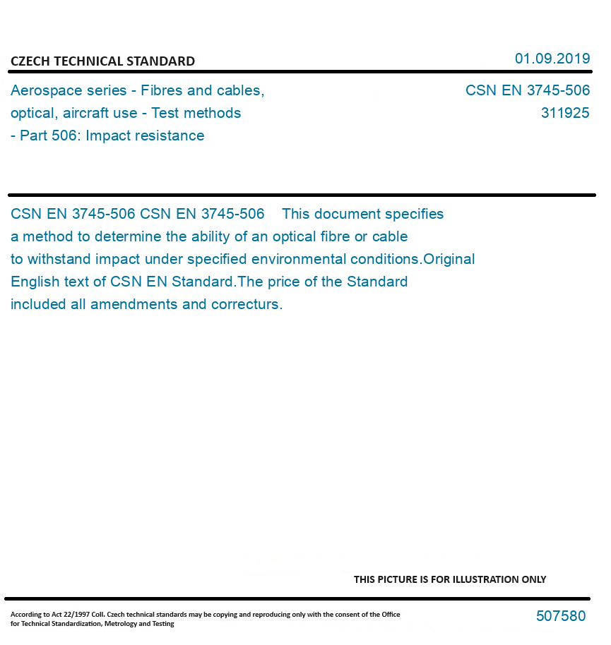 CSN EN 3745-506 This document specifies a method to determine the ability of an optical fibre or cable to withstand impact under specified environmental conditions. Original English text of CSN EN Standard. The price of the Standard included all amendments and correcturs.
