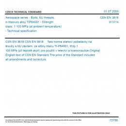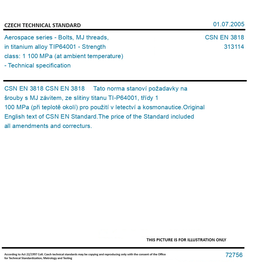 CSN EN 3818 CSN EN 3818 Tato norma stanoví požadavky na šrouby s MJ závitem, ze slitiny titanu TI-P64001, třídy 1 100 MPa (při teplotě okolí) pro použití v letectví a kosmonautice. Original English text of CSN EN Standard. The price of the Standard included all amendments and correcturs.