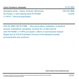 CSN EN 3899 Tato norma stanoví požadavky na závitová pouzdra, tlustostěnná, samojistná, se závity MJ, ze žáruvzdorné oceli FE-PM3801 (17-4PH) pro použití v letectví a kosmonautice. Original English text of CSN EN Standard. The price of the Standard included all amendments and correcturs.