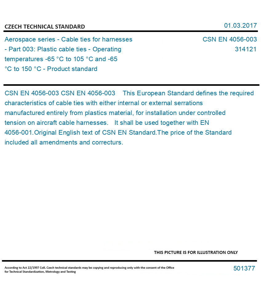 CSN EN 4056-003 This European Standard defines the required characteristics of cable ties with either internal or external serrations manufactured entirely from plastics material, for installation under controlled tension on aircraft cable harnesses. It shall be used together with EN 4056-001. Original English text of CSN EN Standard. The price of the Standard included all amendments and correcturs.