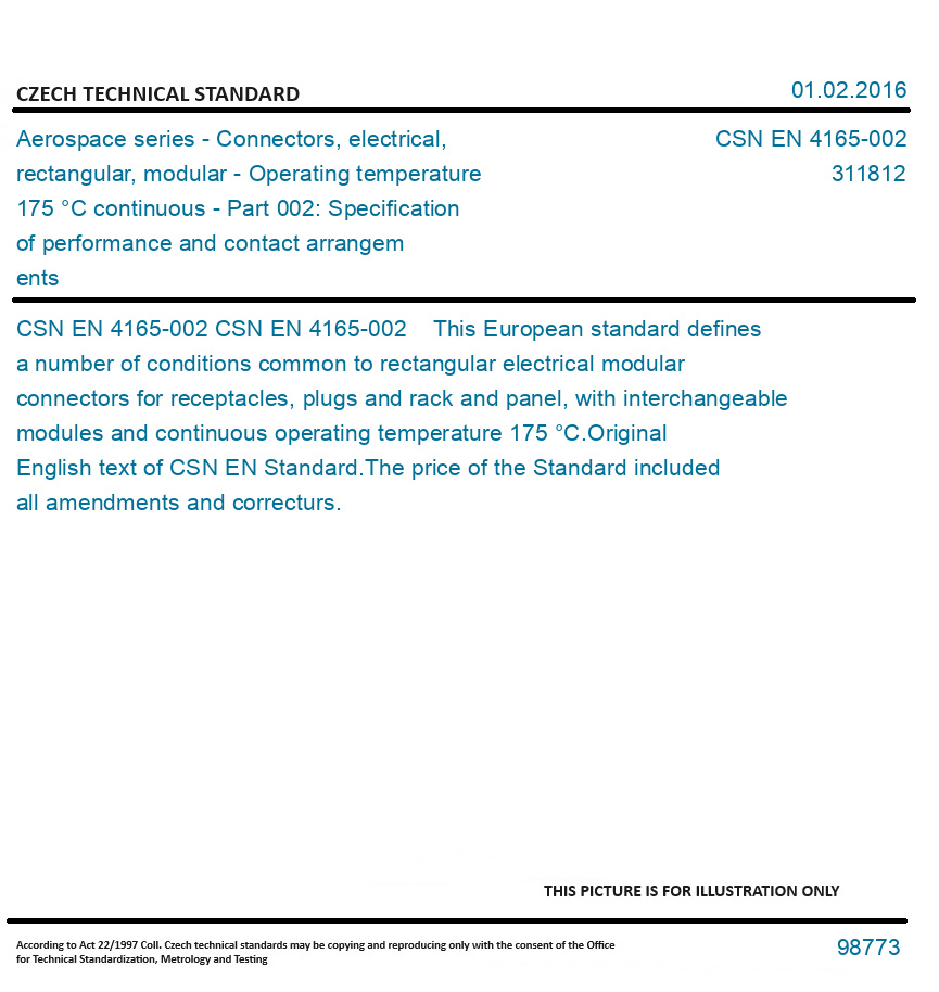 CSN EN 4165-002 This European standard defines a number of conditions common to rectangular electrical modular connectors for receptacles, plugs and rack and panel, with interchangeable modules and continuous operating temperature 175 °C. Original English text of CSN EN Standard. The price of the Standard included all amendments and correcturs.