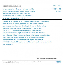 CSN EN 4178 This European Standard specifies the characteristics of screws, pan head, six lobe recess, coarse tolerance normal shank, medium length thread, in titanium alloy, anodized, MoS2 lubricated. Classification: 1 100 MPa 1) / 315 °C 2). 1) Minimum tensile strength of the material at ambient temperature. 2) Maximum temperature that the screw can withstand without continuous change in its original characteristics, after return to ambient temperature. The maximum temperature is determined by the surface treatment. Original English text of CSN EN Standard. The price of the Standard included all amendments and correcturs.