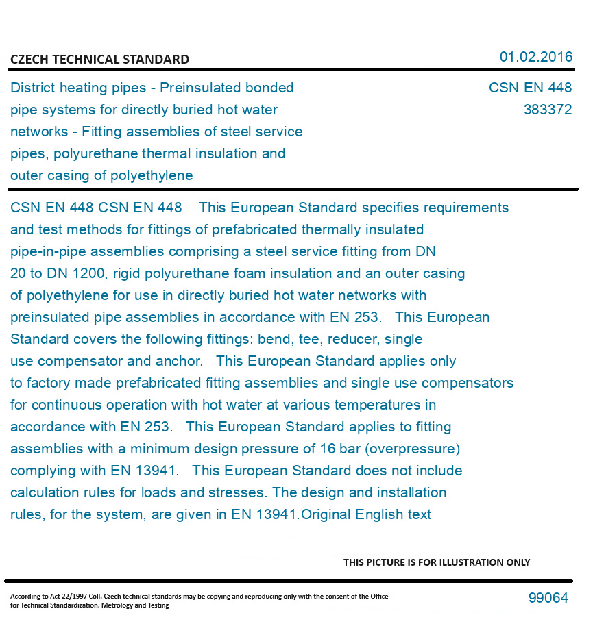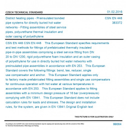 CSN EN 448 This European Standard specifies requirements and test methods for fittings of prefabricated thermally insulated pipe-in-pipe assemblies comprising a steel service fitting from DN 20 to DN 1200, rigid polyurethane foam insulation and an outer casing of polyethylene for use in directly buried hot water networks with preinsulated pipe assemblies in accordance with EN 253. This European Standard covers the following fittings: bend, tee, reducer, single use compensator and anchor. This European Standard applies only to factory made prefabricated fitting assemblies and single use compensators for continuous operation with hot water at various temperatures in accordance with EN 253. This European Standard applies to fitting assemblies with a minimum design pressure of 16 bar (overpressure) complying with EN 13941. This European Standard does not include calculation rules for loads and stresses. The design and installation rules, for the system, are given in EN 13941. Original English text of CSN EN Standard. The price of the Standard included all amendments and correcturs.