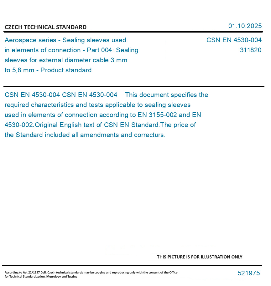 CSN EN 4530-004 This document specifies the required characteristics and tests applicable to sealing sleeves used in elements of connection according to EN 3155-002 and EN 4530-002. Original English text of CSN EN Standard. The price of the Standard included all amendments and correcturs.