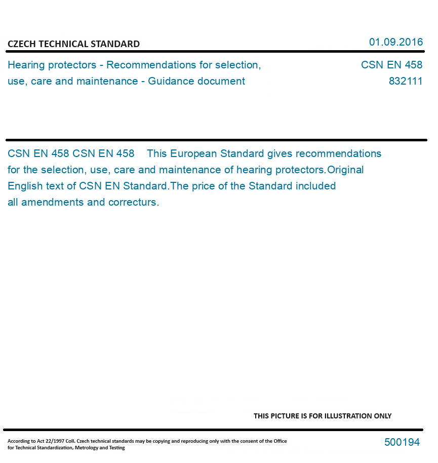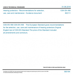 CSN EN 458 This European Standard gives recommendations for the selection, use, care and maintenance of hearing protectors. Original English text of CSN EN Standard. The price of the Standard included all amendments and correcturs.