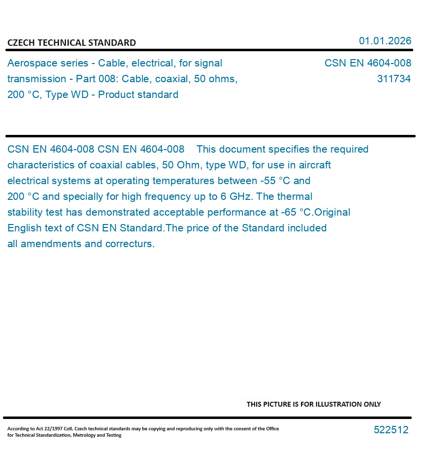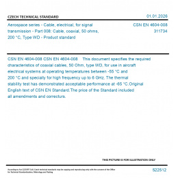 Aerospace series - Cable, electrical, for signal transmission - Part 008: Cable, coaxial, 50 ohms, 200 °C, Type WD - Product standard