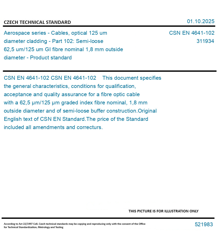 CSN EN 4641-102 This document specifies the general characteristics, conditions for qualification, acceptance and quality assurance for a fibre optic cable with a 62,5 µm/125 µm graded index fibre nominal, 1,8 mm outside diameter and of semi-loose buffer construction. Original English text of CSN EN Standard. The price of the Standard included all amendments and correcturs.