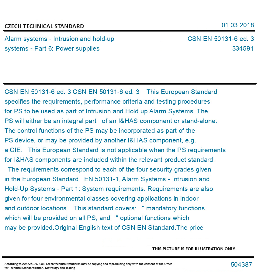 CSN EN 50131-6 ed. 3 This European Standard specifies the requirements, performance criteria and testing procedures for PS to be used as part of Intrusion and Hold up Alarm Systems. The PS will either be an integral part of an I&HAS component or stand-alone. The control functions of the PS may be incorporated as part of the PS device, or may be provided by another I&HAS component, e.g. a CIE. This European Standard is not applicable when the PS requirements for I&HAS components are included within the relevant product standard. The requirements correspond to each of the four security grades given in the European Standard EN 50131-1, Alarm Systems - Intrusion and Hold-Up Systems - Part 1: System requirements. Requirements are also given for four environmental classes covering applications in indoor and outdoor locations. This standard covers: " mandatory functions which will be provided on all PS; and " optional functions which may be provided. Original English text of CSN EN Standard. The price of the Standard included all amendments and correcturs.