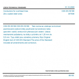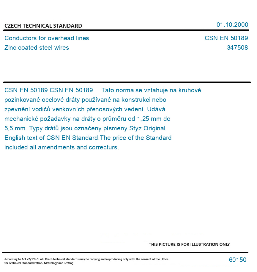 CSN EN 50189 Tato norma se vztahuje na kruhové pozinkované ocelové dráty používané na konstrukci nebo zpevnění vodičů venkovních přenosových vedení. Udává mechanické požadavky na dráty o průměru od 1,25 mm do 5,5 mm. Typy drátů jsou označeny písmeny Styz. Original English text of CSN EN Standard. The price of the Standard included all amendments and correcturs.
