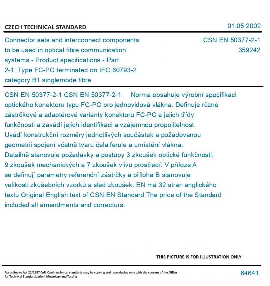 Connector sets and interconnect components to be used in optical fibre communication systems - Product specifications - Part 2-1: Type FC-PC terminated on IEC 60793-2 category B1 singlemode fibre