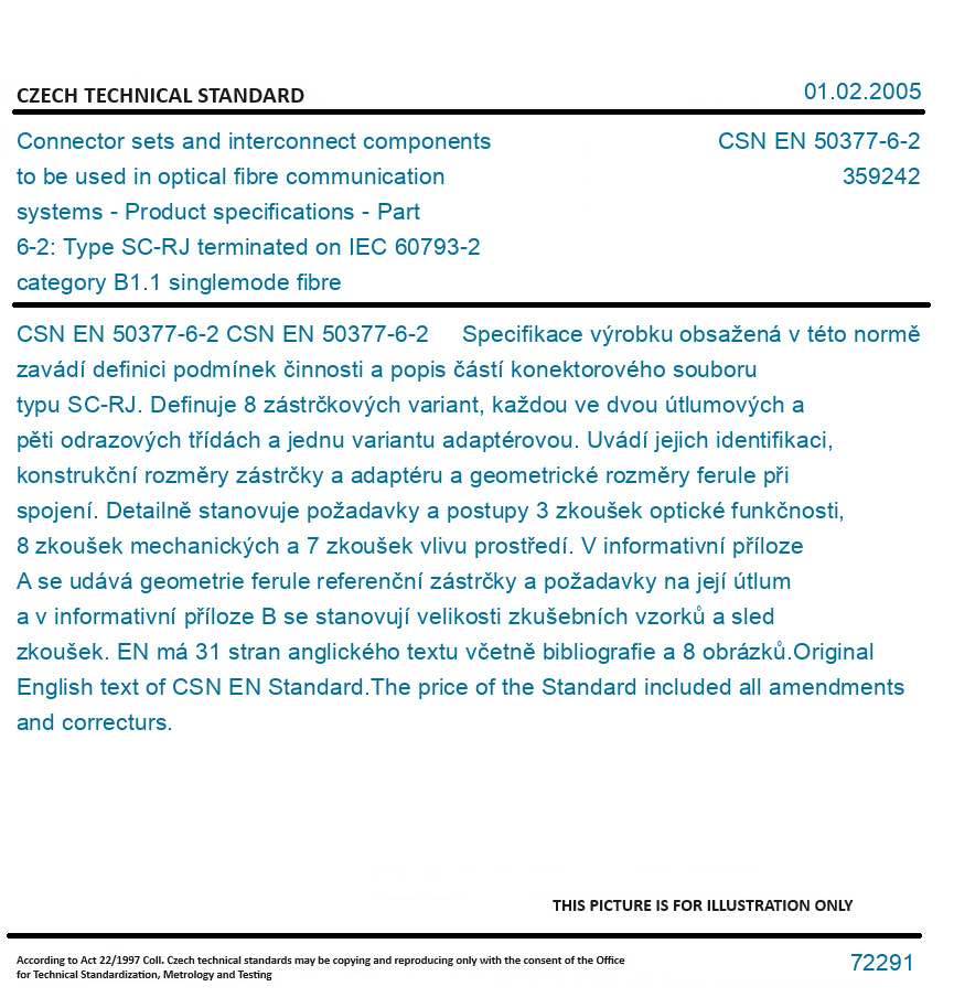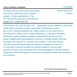 CSN EN 50377-6-2 Specifikace výrobku obsažená v této normě zavádí definici podmínek činnosti a popis částí konektorového souboru typu SC-RJ. Definuje 8 zástrčkových variant, každou ve dvou útlumových a pěti odrazových třídách a jednu variantu adaptérovou. Uvádí jejich identifikaci, konstrukční rozměry zástrčky a adaptéru a geometrické rozměry ferule při spojení. Detailně stanovuje požadavky a postupy 3 zkoušek optické funkčnosti, 8 zkoušek mechanických a 7 zkoušek vlivu prostředí. V informativní příloze A se udává geometrie ferule referenční zástrčky a požadavky na její útlum a v informativní příloze B se stanovují velikosti zkušebních vzorků a sled zkoušek. EN má 31 stran anglického textu včetně bibliografie a 8 obrázků. Original English text of CSN EN Standard. The price of the Standard included all amendments and correcturs.