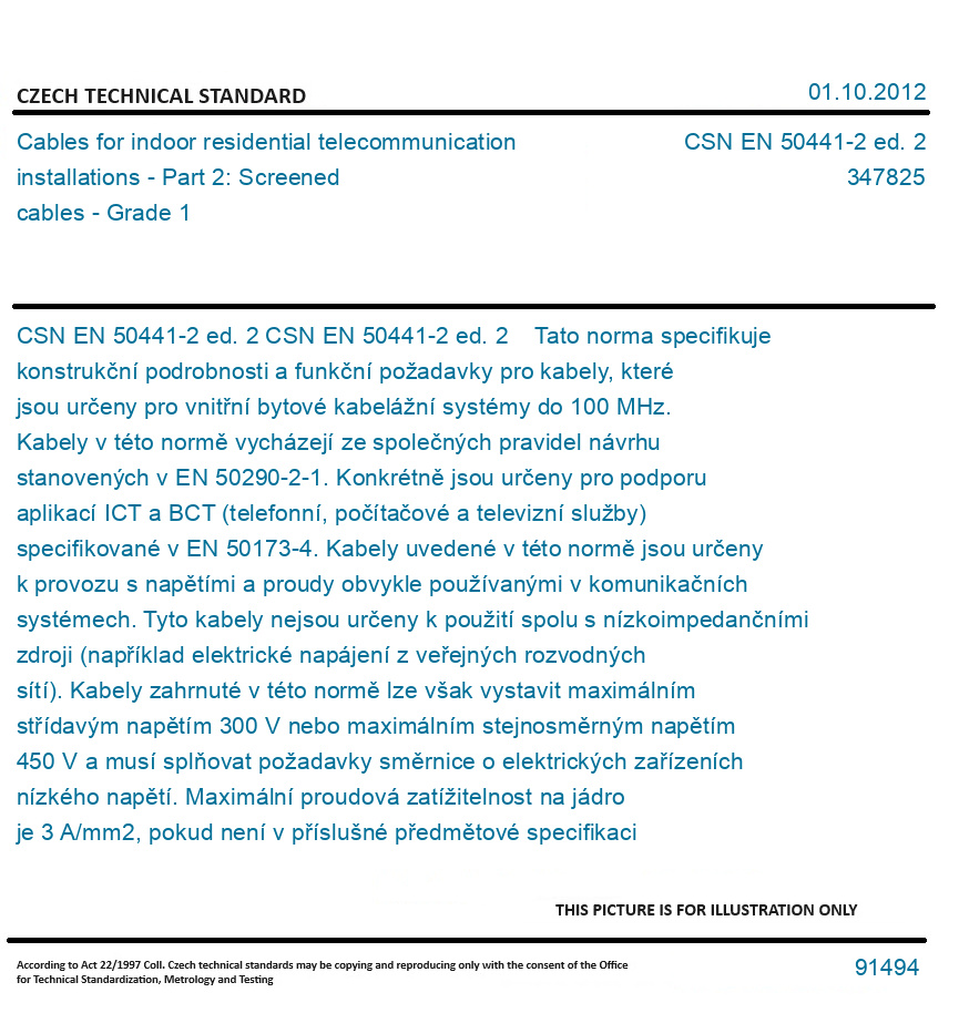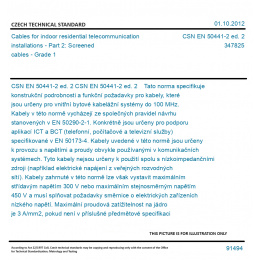CSN EN 50441-2 ed. 2 Tato norma specifikuje konstrukční podrobnosti a funkční požadavky pro kabely, které jsou určeny pro vnitřní bytové kabelážní systémy do 100 MHz. Kabely v této normě vycházejí ze společných pravidel návrhu stanovených v EN 50290-2-1. Konkrétně jsou určeny pro podporu aplikací ICT a BCT (telefonní, počítačové a televizní služby) specifikované v EN 50173-4. Kabely uvedené v této normě jsou určeny k provozu s napětími a proudy obvykle používanými v komunikačních systémech. Tyto kabely nejsou určeny k použití spolu s nízkoimpedančními zdroji (například elektrické napájení z veřejných rozvodných sítí). Kabely zahrnuté v této normě lze však vystavit maximálním střídavým napětím 300 V nebo maximálním stejnosměrným napětím 450 V a musí splňovat požadavky směrnice o elektrických zařízeních nízkého napětí. Maximální proudová zatížitelnost na jádro je 3 A/mm2, pokud není v příslušné předmětové specifikaci stanoveno jinak. Original English text of CSN EN Standard. The price of the Standard included all amendments and correcturs.