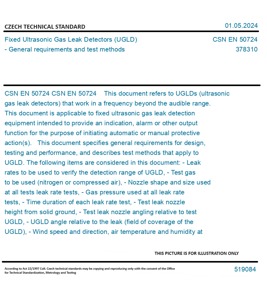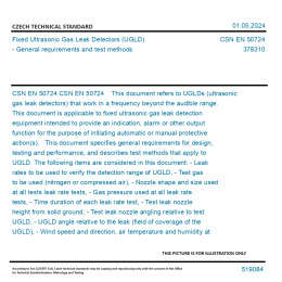 CSN EN 50724 This document refers to UGLDs (ultrasonic gas leak detectors) that work in a frequency beyond the audible range. This document is applicable to fixed ultrasonic gas leak detection equipment intended to provide an indication, alarm or other output function for the purpose of initiating automatic or manual protective action(s). This document specifies general requirements for design, testing and performance, and describes test methods that apply to UGLD. The following items are considered in this document: - Leak rates to be used to verify the detection range of UGLD, - Test gas to be used (nitrogen or compressed air), - Nozzle shape and size used at all tests leak rate tests, - Gas pressure used at all leak rate tests, - Time duration of each leak rate test, - Test leak nozzle height from solid ground, - Test leak nozzle angling relative to test UGLD, - UGLD angle relative to the leak (field of coverage of the UGLD), - Wind speed and direction, air temperature and humidity at day of test, - Minimum distance to solid structures (walls, etc.) at test site, - Installation height relative to the ground, - Texture of solid ground between leak and UGLD, - Background noise sources, known to interfere with UGLDs, - Specification of detection radius in 3 dimensions, - Operational requirements such as temperature, vibration, etc. This document is also applicable when an equipment manufacturer makes any claims regarding any special features of construction or superior performance that exceed the minimum requirements of this document. This document prescribes that all such claims are verified, and that the test procedures are extended or supplemented, where necessary, to verify the claimed performance. The additional tests are agreed between the manufacturer and test laboratory and identified and described in the test report. This document does not apply to portable gas detectors using ultrasonic measurements nor to gas detectors using non-ultrasonic measurements to detect a gas leak. Original English text of CSN EN Standard. The price of the Standard included all amendments and correcturs.