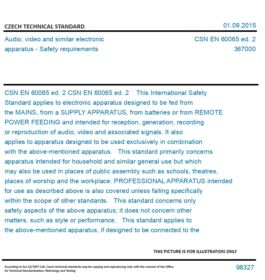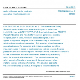 CSN EN 60065 ed. 2 This International Safety Standard applies to electronic apparatus designed to be fed from the MAINS, from a SUPPLY APPARATUS, from batteries or from REMOTE POWER FEEDING and intended for reception, generation, recording or reproduction of audio, video and associated signals. It also applies to apparatus designed to be used exclusively in combination with the above-mentioned apparatus. This standard primarily concerns apparatus intended for household and similar general use but which may also be used in places of public assembly such as schools, theatres, places of worship and the workplace. PROFESSIONAL APPARATUS intended for use as described above is also covered unless falling specifically within the scope of other standards. This standard concerns only safety aspects of the above apparatus; it does not concern other matters, such as style or performance. This standard applies to the above-mentioned apparatus, if designed to be connected to the TELECOMMUNICATION NETWORK or similar network, for example by means of an integrated modem. Original English text of CSN EN Standard. The price of the Standard included all amendments and correcturs.