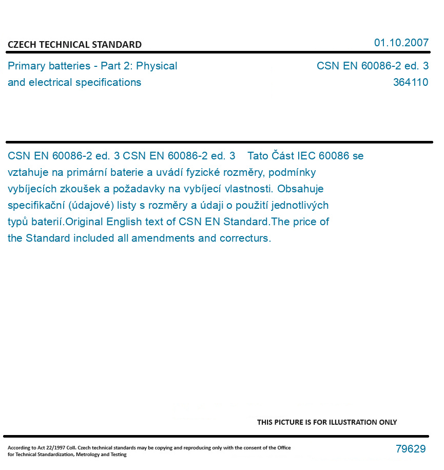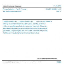 CSN EN 60086-2 ed. 3 Tato Část IEC 60086 se vztahuje na primární baterie a uvádí fyzické rozměry, podmínky vybíjecích zkoušek a požadavky na vybíjecí vlastnosti. Obsahuje specifikační (údajové) listy s rozměry a údaji o použití jednotlivých typů baterií. Original English text of CSN EN Standard. The price of the Standard included all amendments and correcturs.