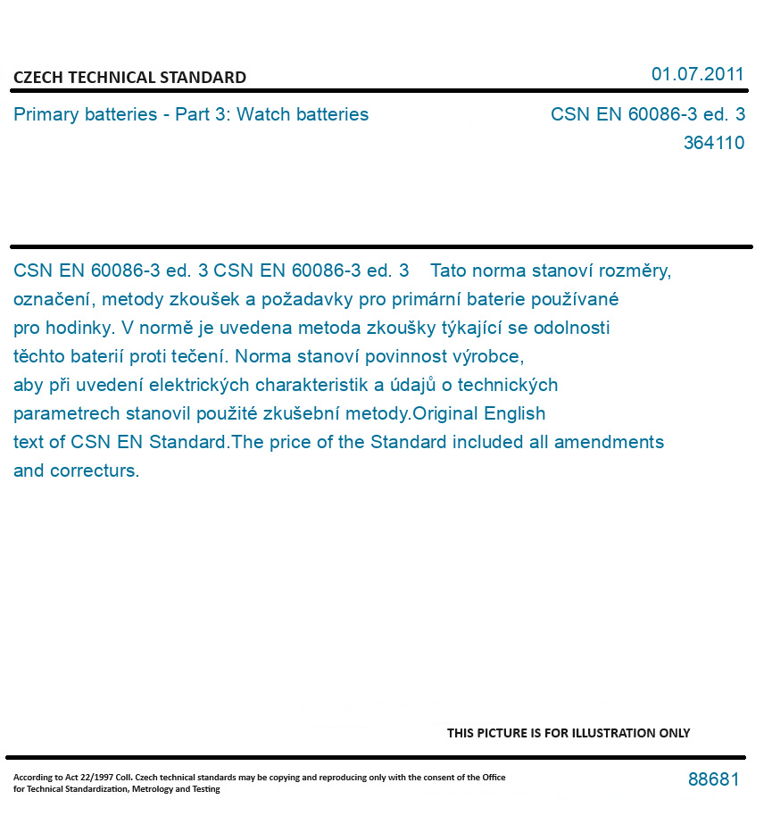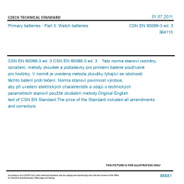 CSN EN 60086-3 ed. 3 Tato norma stanoví rozměry, označení, metody zkoušek a požadavky pro primární baterie používané pro hodinky. V normě je uvedena metoda zkoušky týkající se odolnosti těchto baterií proti tečení. Norma stanoví povinnost výrobce, aby při uvedení elektrických charakteristik a údajů o technických parametrech stanovil použité zkušební metody. Original English text of CSN EN Standard. The price of the Standard included all amendments and correcturs.