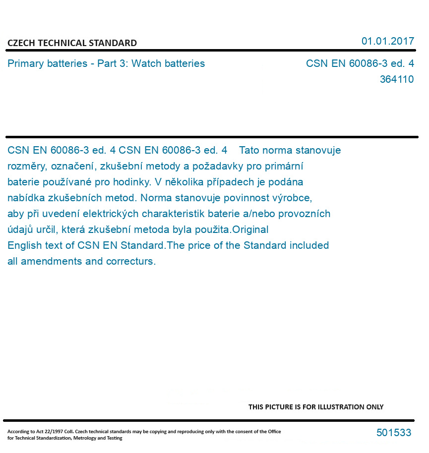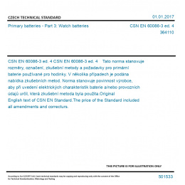 CSN EN 60086-3 ed. 4 Tato norma stanovuje rozměry, označení, zkušební metody a požadavky pro primární baterie používané pro hodinky. V několika případech je podána nabídka zkušebních metod. Norma stanovuje povinnost výrobce, aby při uvedení elektrických charakteristik baterie a/nebo provozních údajů určil, která zkušební metoda byla použita. Original English text of CSN EN Standard. The price of the Standard included all amendments and correcturs.