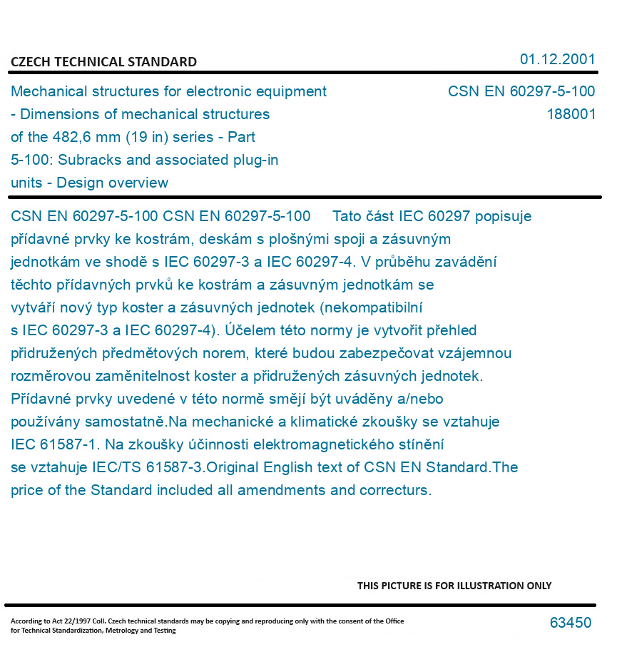 Number of Standard: CSN EN 60297-5-100 Category: 188001 Pages: 4 Released: 01.12.2001 Catalog number: 63450