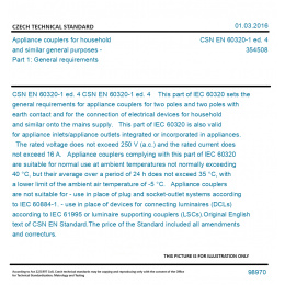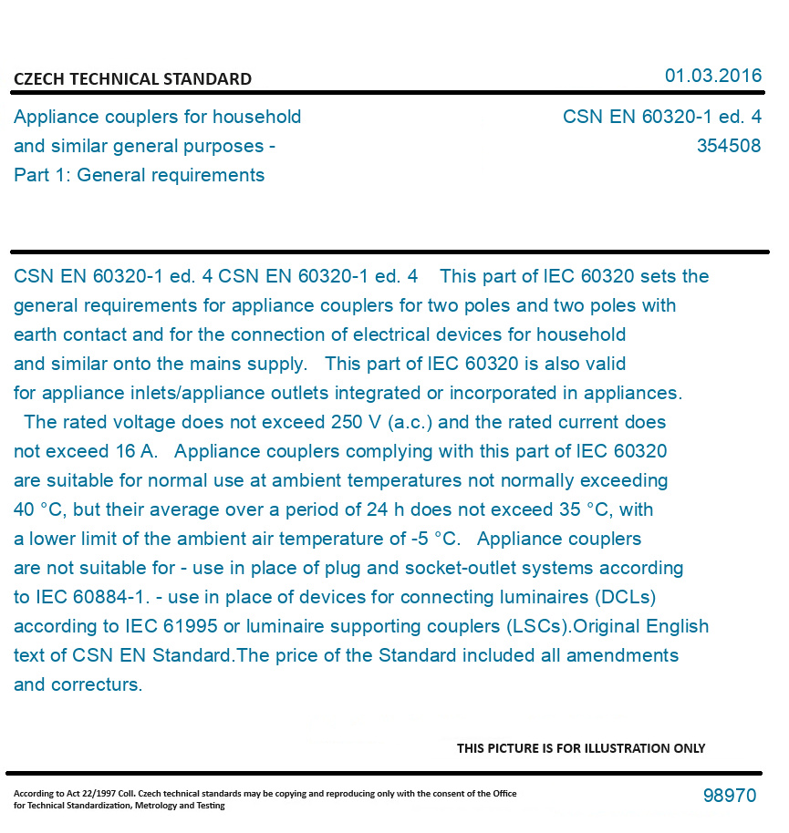 CSN EN 60320-1 ed. 4 This part of lEC 60320 sets the general requirements for appliance couplers for two poles and two poles with earth contact and for the connection of electrical devices for household and similar onto the mains supply. This part of lEC 60320 is also valid for appliance inlets/appliance outlets integrated or incorporated in appliances. The rated voltage does not exceed 250 V (a.c.) and the rated current does not exceed 16 A. Appliance couplers complying with this part of lEC 60320 are suitable for normal use at ambient temperatures not normally exceeding 40 °C, but their average over a period of 24 h does not exceed 35 °C, with a lower limit of the ambient air temperature of -5 °C. Appliance couplers are not suitable for - use in place of plug and socket-outlet systems according to IEC 60884-1. - use in place of devices for connecting luminaires (DCLs) according to IEC 61995 or luminaire supporting couplers (LSCs). Original English text of CSN EN Standard. The price of the Standard included all amendments and correcturs.