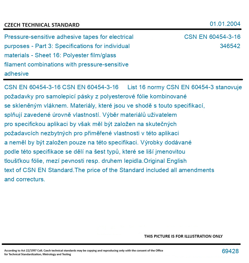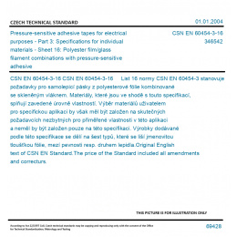 CSN EN 60454-3-16 List 16 normy CSN EN 60454-3 stanovuje požadavky pro samolepicí pásky z polyesterové fólie kombinované se skleněným vláknem. Materiály, které jsou ve shodě s touto specifikací, splňují zavedené úrovně vlastností. Výběr materiálů uživatelem pro specifickou aplikaci by však měl být založen na skutečných požadavcích nezbytných pro přiměřené vlastnosti v této aplikaci a neměl by být založen pouze na této specifikaci. Výrobky dodávané podle této specifikace se dělí na šest typů, které se liší jmenovitou tloušťkou fólie, mezí pevnosti resp. druhem lepidla. Original English text of CSN EN Standard. The price of the Standard included all amendments and correcturs.