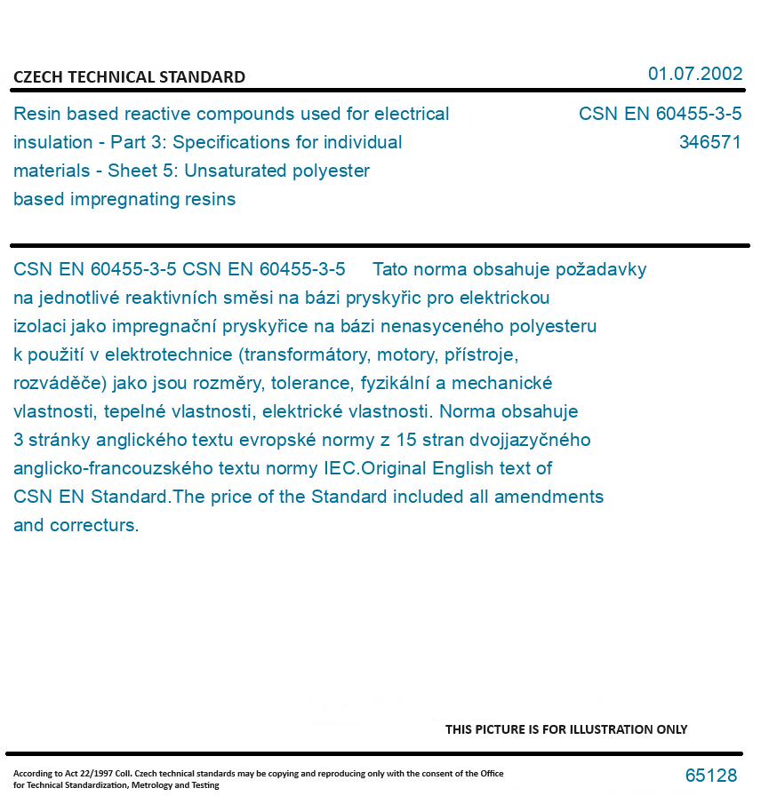 Number of Standard: CSN EN 60455-3-5 Category: 346571 Pages: 4 Released: 01.07.2002 Catalog number: 65128