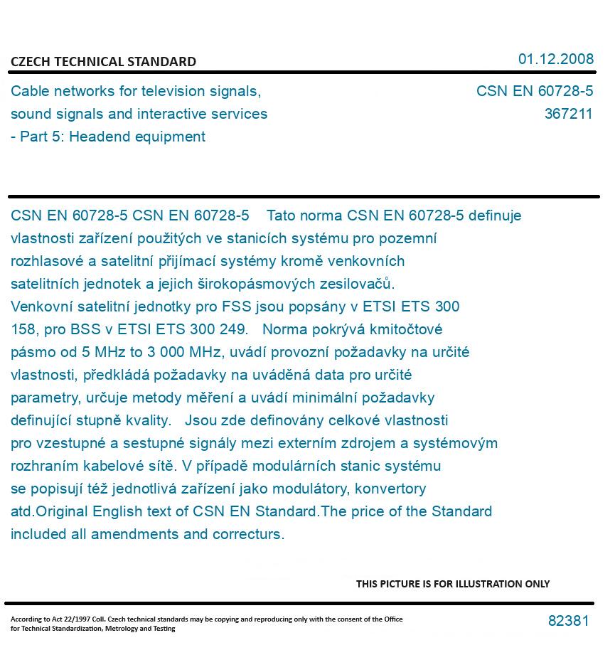 CSN EN 60728-5 Tato norma CSN EN 60728-5 definuje vlastnosti zařízení použitých ve stanicích systému pro pozemní rozhlasové a satelitní přijímací systémy kromě venkovních satelitních jednotek a jejich širokopásmových zesilovačů. Venkovní satelitní jednotky pro FSS jsou popsány v ETSI ETS 300 158, pro BSS v ETSI ETS 300 249. Norma pokrývá kmitočtové pásmo od 5 MHz to 3 000 MHz, uvádí provozní požadavky na určité vlastnosti, předkládá požadavky na uváděná data pro určité parametry, určuje metody měření a uvádí minimální požadavky definující stupně kvality. Jsou zde definovány celkové vlastnosti pro vzestupné a sestupné signály mezi externím zdrojem a systémovým rozhraním kabelové sítě. V případě modulárních stanic systému se popisují též jednotlivá zařízení jako modulátory, konvertory atd. Original English text of CSN EN Standard. The price of the Standard included all amendments and correcturs.