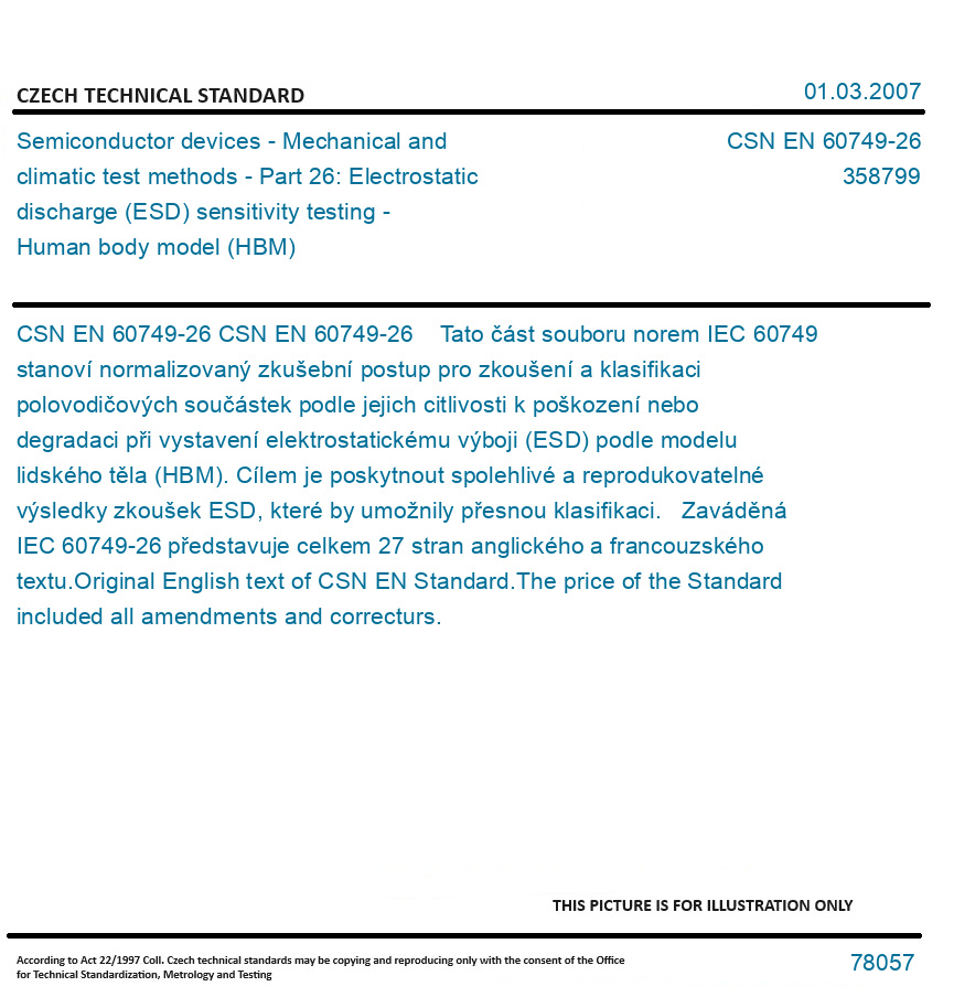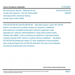 CSN EN 60749-26 Tato část souboru norem IEC 60749 stanoví normalizovaný zkušební postup pro zkoušení a klasifikaci polovodičových součástek podle jejich citlivosti k poškození nebo degradaci při vystavení elektrostatickému výboji (ESD) podle modelu lidského těla (HBM). Cílem je poskytnout spolehlivé a reprodukovatelné výsledky zkoušek ESD, které by umožnily přesnou klasifikaci. Zaváděná IEC 60749-26 představuje celkem 27 stran anglického a francouzského textu. Original English text of CSN EN Standard. The price of the Standard included all amendments and correcturs.
