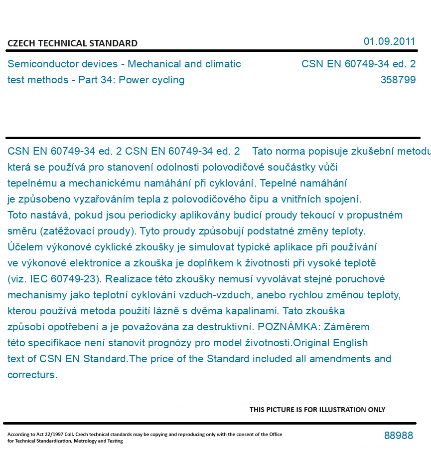 CSN EN 60749-34 ed. 2 Tato norma popisuje zkušební metodu, která se používá pro stanovení odolnosti polovodičové součástky vůči tepelnému a mechanickému namáhání při cyklování. Tepelné namáhání je způsobeno vyzařováním tepla z polovodičového čipu a vnitřních spojení. Toto nastává, pokud jsou periodicky aplikovány budicí proudy tekoucí v propustném směru (zatěžovací proudy). Tyto proudy způsobují podstatné změny teploty. Účelem výkonové cyklické zkoušky je simulovat typické aplikace při používání ve výkonové elektronice a zkouška je doplňkem k životnosti při vysoké teplotě (viz. IEC 60749-23). Realizace této zkoušky nemusí vyvolávat stejné poruchové mechanismy jako teplotní cyklování vzduch-vzduch, anebo rychlou změnou teploty, kterou používá metoda použití lázně s dvěma kapalinami. Tato zkouška způsobí opotřebení a je považována za destruktivní. POZNÁMKA: Záměrem této specifikace není stanovit prognózy pro model životnosti. Original English text of CSN EN Standard. The price of the Standard included all amendments and correcturs.