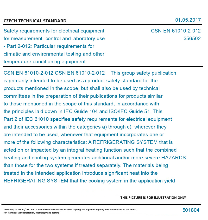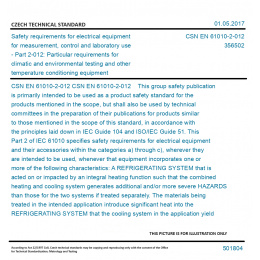 CSN EN 61010-2-012 This group safety publication is primarily intended to be used as a product safety standard for the products mentioned in the scope, but shall also be used by technical committees in the preparation of their publications for products similar to those mentioned in the scope of this standard, in accordance with the principles laid down in IEC Guide 104 and lSO/lEC Guide 51. This Part 2 of IEC 61010 specifies safety requirements for electrical equipment and their accessories within the categories a) through c), wherever they are intended to be used, whenever that equipment incorporates one or more of the following characteristics: A REFRIGERATING SYSTEM that is acted on or impacted by an integral heating function such that the combined heating and cooling system generates additional and/or more severe HAZARDS than those for the two systems if treated separately. The materials being treated in the intended application introduce significant heat into the REFRIGERATING SYSTEM that the cooling system in the application yield additional and/or more severe HAZARDS than those for the cooling system if operated at the maximum RATED ambient alone. An irradiation function for the materials being treated presenting additional HAZARDS. A function to expose the materials being treated to excessive humidity, carbon dioxide, salt mist, or other substances which may result in additional HAZARDS. A function of MECHANICAL MOVEMENT presenting additional HAZARDS. Provision for an OPERATOR to walk-in to the operating area to load or unload the materials being treated. Original English text of CSN EN Standard. The price of the Standard included all amendments and correcturs.