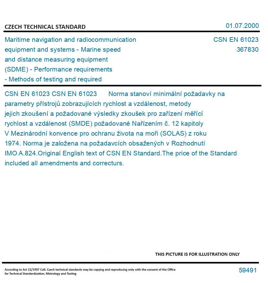 CSN EN 61023 Maritime navigation and radiocommunication equipment and systems - Marine speed and distance measuring equipment (SDME) - Performance requirements - Methods of testing and required test results