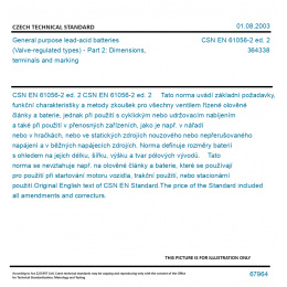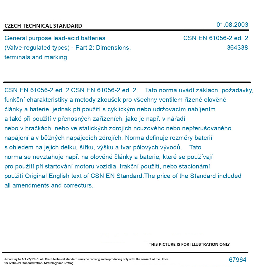 CSN EN 61056-2 ed. 2 Tato norma uvádí základní požadavky, funkční charakteristiky a metody zkoušek pro všechny ventilem řízené olověné články a baterie, jednak při použití s cyklickým nebo udržovacím nabíjením a také při použití v přenosných zařízeních, jako je např. v nářadí nebo v hračkách, nebo ve statických zdrojích nouzového nebo nepřerušovaného napájení a v běžných napájecích zdrojích. Norma definuje rozměry baterií s ohledem na jejich délku, šířku, výšku a tvar pólových vývodů. Tato norma se nevztahuje např. na olověné články a baterie, které se používají pro použití při startování motoru vozidla, trakční použití, nebo stacionární použití. Original English text of CSN EN Standard. The price of the Standard included all amendments and correcturs.