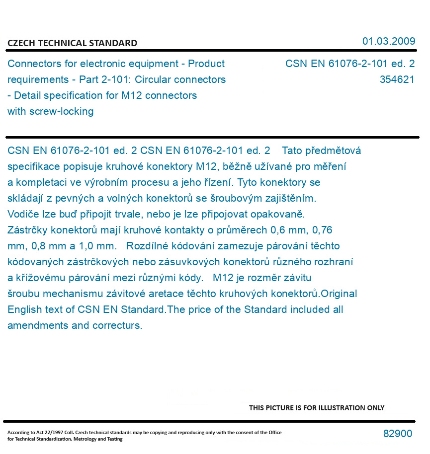 CSN EN 61076-2-101 ed. 2 Tato předmětová specifikace popisuje kruhové konektory M12, běžně užívané pro měření a kompletaci ve výrobním procesu a jeho řízení. Tyto konektory se skládají z pevných a volných konektorů se šroubovým zajištěním. Vodiče lze buď připojit trvale, nebo je lze připojovat opakovaně. Zástrčky konektorů mají kruhové kontakty o průměrech 0,6 mm, 0,76 mm, 0,8 mm a 1,0 mm. Rozdílné kódování zamezuje párování těchto kódovaných zástrčkových nebo zásuvkových konektorů různého rozhraní a křížovému párování mezi různými kódy. M12 je rozměr závitu šroubu mechanismu závitové aretace těchto kruhových konektorů. Original English text of CSN EN Standard. The price of the Standard included all amendments and correcturs.