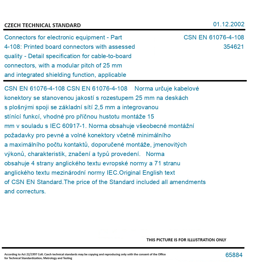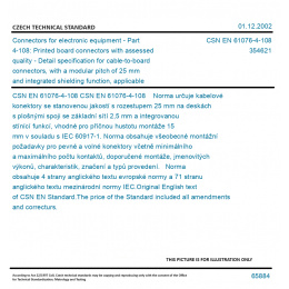 >CSN Standards>35 ELECTRICAL ENGINEERING>3546 Communication sockets and plugs, connectors>CSN EN 61076-4-108 - Connectors for electronic equipment - Part 4-108: Printed board connectors with assessed quality - Detail specification for cable-to-board connectors, with a modular pitch of 25 mm and integrated shielding function, applicable for transverse packing density of 15 mm, having a basic grid of 2,5 mm in accordance with IEC 60917-1
