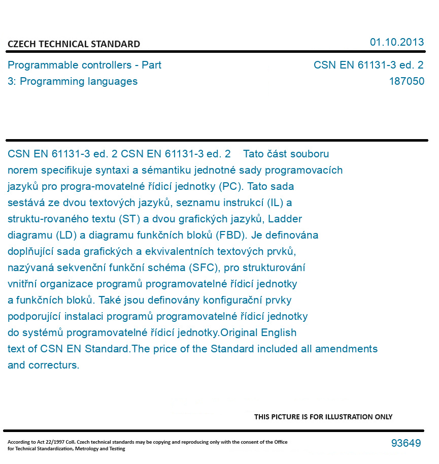 CSN EN 61131-3 ed. 2 Tato část souboru norem specifikuje syntaxi a sémantiku jednotné sady programovacích jazyků pro progra-movatelné řídicí jednotky (PC). Tato sada sestává ze dvou textových jazyků, seznamu instrukcí (IL) a struktu-rovaného textu (ST) a dvou grafických jazyků, Ladder diagramu (LD) a diagramu funkčních bloků (FBD). Je definována doplňující sada grafických a ekvivalentních textových prvků, nazývaná sekvenční funkční schéma (SFC), pro strukturování vnitřní organizace programů programovatelné řídicí jednotky a funkčních bloků. Také jsou definovány konfigurační prvky podporující instalaci programů programovatelné řídicí jednotky do systémů programovatelné řídicí jednotky. Original English text of CSN EN Standard. The price of the Standard included all amendments and correcturs.