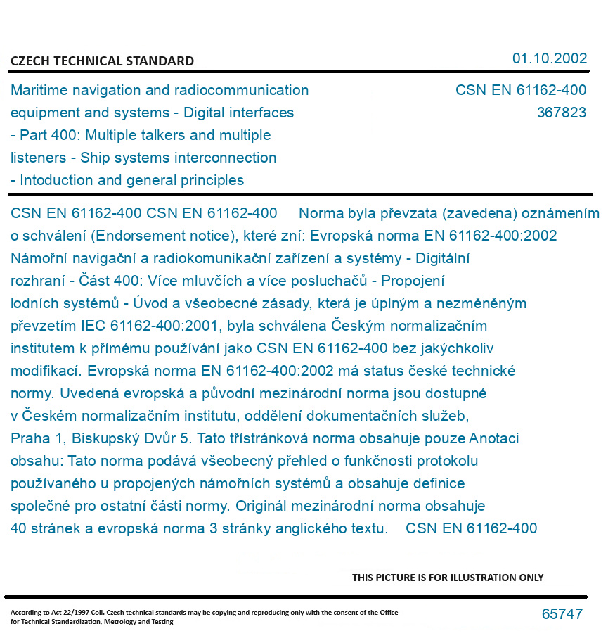CSN EN 61162-400 Norma byla převzata (zavedena) oznámením o schválení (Endorsement notice), které zní: Evropská norma EN 61162-400:2002 Námořní navigační a radiokomunikační zařízení a systémy - Digitální rozhraní - Část 400: Více mluvčích a více posluchačů - Propojení lodních systémů - Úvod a všeobecné zásady, která je úplným a nezměněným převzetím IEC 61162-400:2001, byla schválena Českým normalizačním institutem k přímému používání jako CSN EN 61162-400 bez jakýchkoliv modifikací. Evropská norma EN 61162-400:2002 má status české technické normy. Uvedená evropská a původní mezinárodní norma jsou dostupné v Českém normalizačním institutu, oddělení dokumentačních služeb, Praha 1, Biskupský Dvůr 5. Tato třístránková norma obsahuje pouze Anotaci obsahu: Tato norma podává všeobecný přehled o funkčnosti protokolu používaného u propojených námořních systémů a obsahuje definice společné pro ostatní části normy. Originál mezinárodní norma obsahuje 40 stránek a evropská norma 3 stránky anglického textu. CSN EN 61162-400 (36 7823) byla vydána v říjnu 2002.