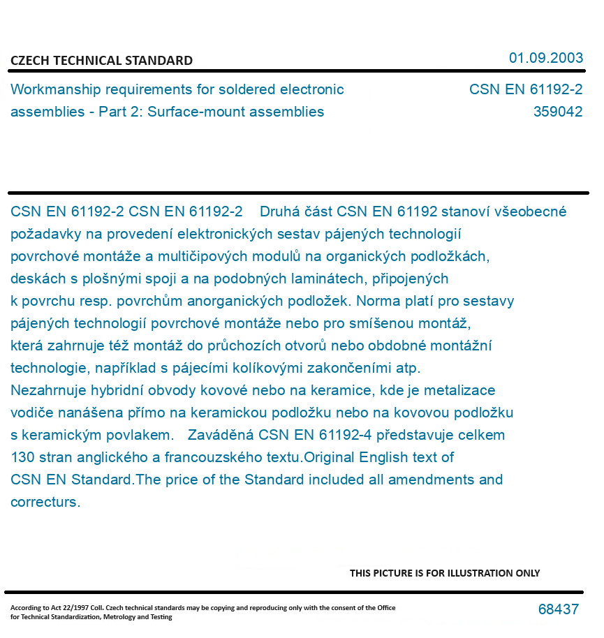 CSN EN 61192-2 Druhá část CSN EN 61192 stanoví všeobecné požadavky na provedení elektronických sestav pájených technologií povrchové montáže a multičipových modulů na organických podložkách, deskách s plošnými spoji a na podobných laminátech, připojených k povrchu resp. povrchům anorganických podložek. Norma platí pro sestavy pájených technologií povrchové montáže nebo pro smíšenou montáž, která zahrnuje též montáž do průchozích otvorů nebo obdobné montážní technologie, například s pájecími kolíkovými zakončeními atp. Nezahrnuje hybridní obvody kovové nebo na keramice, kde je metalizace vodiče nanášena přímo na keramickou podložku nebo na kovovou podložku s keramickým povlakem. Zaváděná CSN EN 61192-4 představuje celkem 130 stran anglického a francouzského textu. Original English text of CSN EN Standard. The price of the Standard included all amendments and correcturs.