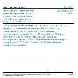 >CSN Standards>35 ELECTRICAL ENGINEERING>3590 Printed wiring>CSN EN 61249-2-19 - Materials for printed boards and other interconnecting structures - Part 2-19: Reinforced base materials, clad and unclad - Epoxide cross-plied linear fibreglass-reinforced laminated sheets of defined flammability (vertical burning test) copper-clad