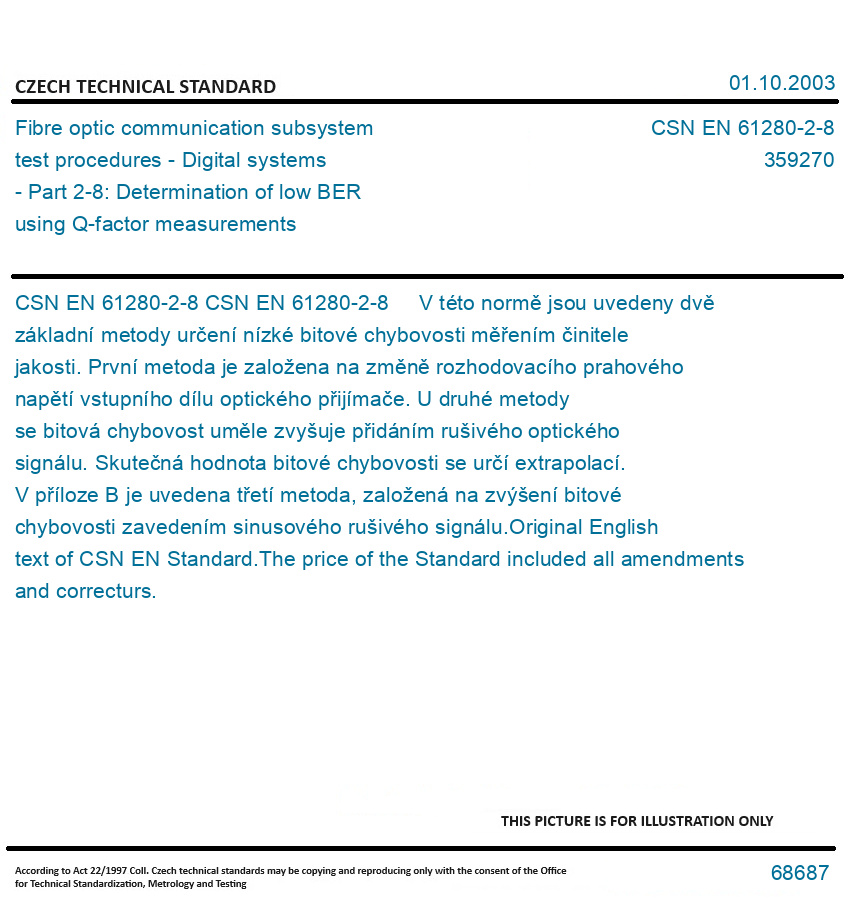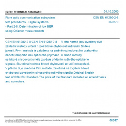 CSN EN 61280-2-8 V této normě jsou uvedeny dvě základní metody určení nízké bitové chybovosti měřením činitele jakosti. První metoda je založena na změně rozhodovacího prahového napětí vstupního dílu optického přijímače. U druhé metody se bitová chybovost uměle zvyšuje přidáním rušivého optického signálu. Skutečná hodnota bitové chybovosti se určí extrapolací. V příloze B je uvedena třetí metoda, založená na zvýšení bitové chybovosti zavedením sinusového rušivého signálu. Original English text of CSN EN Standard. The price of the Standard included all amendments and correcturs.