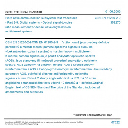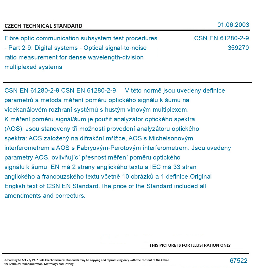CSN EN 61280-2-9 V této normě jsou uvedeny definice parametrů a metoda měření poměru optického signálu k šumu na vícekanálovém rozhraní systémů s hustým vlnovým multiplexem. K měření poměru signál/šum je použit analyzátor optického spektra (AOS). Jsou stanoveny tři možnosti provedení analyzátoru optického spektra: AOS založený na difrakční mřížce, AOS s Michelsonovým interferometrem a AOS s Fabryovým-Perotovým interferometrem. Jsou uvedeny parametry AOS, ovlivňující přesnost měření poměru optického signálu k šumu. EN má 2 strany anglického textu a IEC má 33 stran anglického a francouzského textu včetně 10 obrázků a 1 definice. Original English text of CSN EN Standard. The price of the Standard included all amendments and correcturs.