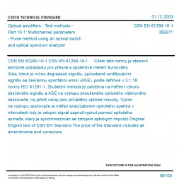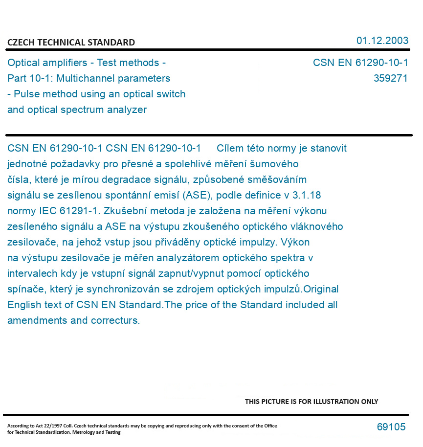CSN EN 61290-10-1 Cílem této normy je stanovit jednotné požadavky pro přesné a spolehlivé měření šumového čísla, které je mírou degradace signálu, způsobené směšováním signálu se zesílenou spontánní emisí (ASE), podle definice v 3.1.18 normy IEC 61291-1. Zkušební metoda je založena na měření výkonu zesíleného signálu a ASE na výstupu zkoušeného optického vláknového zesilovače, na jehož vstup jsou přiváděny optické impulzy. Výkon na výstupu zesilovače je měřen analyzátorem optického spektra v intervalech kdy je vstupní signál zapnut/vypnut pomocí optického spínače, který je synchronizován se zdrojem optických impulzů. Original English text of CSN EN Standard. The price of the Standard included all amendments and correcturs.
