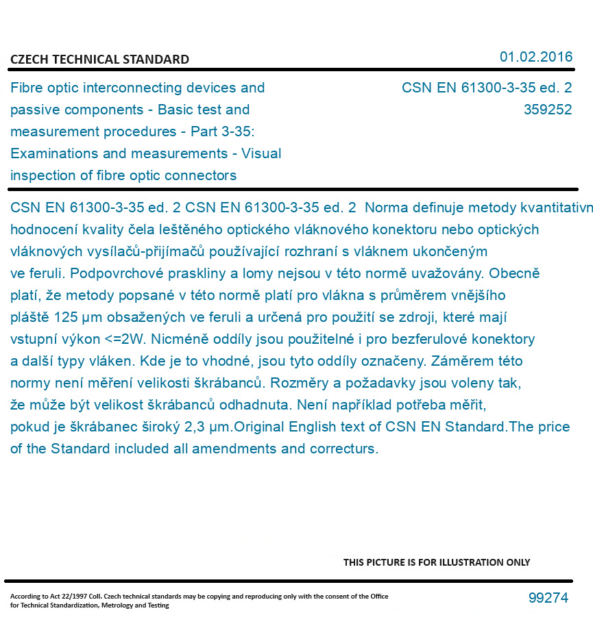 CSN EN 61300-3-35 ed. 2 Norma definuje metody kvantitativního hodnocení kvality čela leštěného optického vláknového konektoru nebo optických vláknových vysílačů-přijímačů používající rozhraní s vláknem ukončeným ve feruli. Podpovrchové praskliny a lomy nejsou v této normě uvažovány. Obecně platí, že metody popsané v této normě platí pro vlákna s průměrem vnějšího pláště 125 µm obsažených ve feruli a určená pro použití se zdroji, které mají vstupní výkon <=2W. Nicméně oddíly jsou použitelné i pro bezferulové konektory a další typy vláken. Kde je to vhodné, jsou tyto oddíly označeny. Záměrem této normy není měření velikosti škrábanců. Rozměry a požadavky jsou voleny tak, že může být velikost škrábanců odhadnuta. Není například potřeba měřit, pokud je škrábanec široký 2,3 µm.