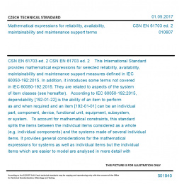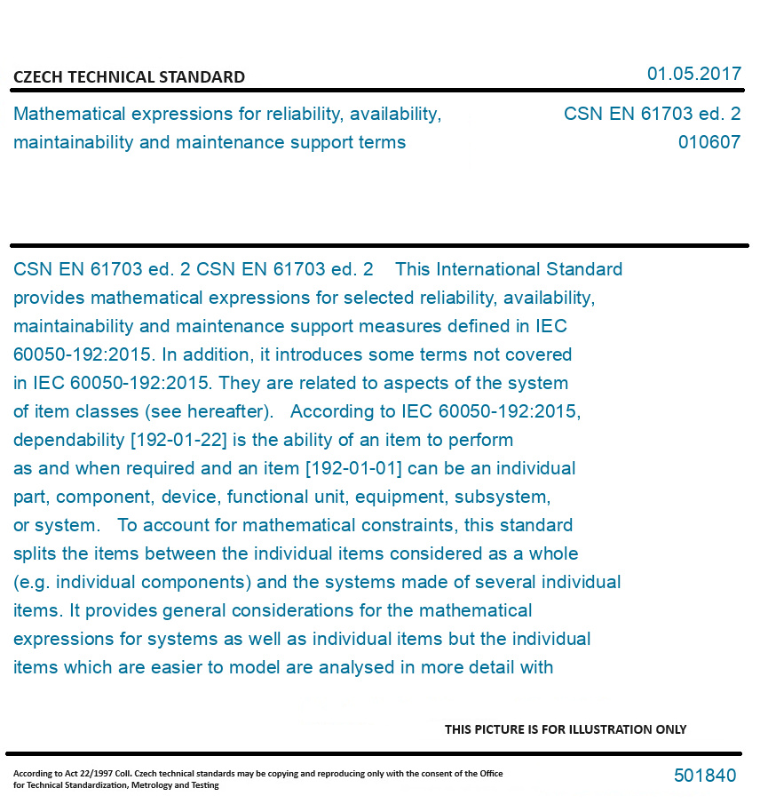 CSN EN 61703 ed. 2 This International Standard provides mathematical expressions for selected reliability, availability, maintainability and maintenance support measures defined in IEC 60050192:2015. In addition, it introduces some terms not covered in IEC 60050-192:2015. They are related to aspects of the system of item classes (see hereafter). According to IEC 60050-192:2015, dependability [192-01-22] is the ability of an item to perform as and when required and an item [192-01-01] can be an individual part, component, device, functional unit, equipment, subsystem, or system. To account for mathematical constraints, this standard splits the items between the individual items considered as a whole (e.g. individual components) and the systems made of several individual items. It provides general considerations for the mathematical expressions for systems as well as individual items but the individual items which are easier to model are analysed in more detail with regards to their repair aspects. The following item classes are considered separately: - Systems; - Individual items: - non-repairable [192-01-12]; - repairable [192-01-11]: i) with zero (or negligible) time to restoration; ii) with non-zero time to restoration. In order to explain the dependability concepts which can be difficult to understand, keep the standard self-contained and the mathematical formulae as simple as possible, the following basic mathematical models are used in this standard to quantify dependability measures: - Systems: - state-transition models; - Markovian models. - Individual items: - random variable (time to failure) for non-repairable items; - simple (ordinary) renewal process for repairable items with zero time to restoration; - simple (ordinary) alternating renewal process for repairable items with non-zero time to restoration. The application of each dependability measure is illustrated by means of simple examples. This standard is mainly applicable to hardware dependability, but many terms and their definitions may be applied to items containing software. Original English text of CSN EN Standard. The price of the Standard included all amendments and correcturs.