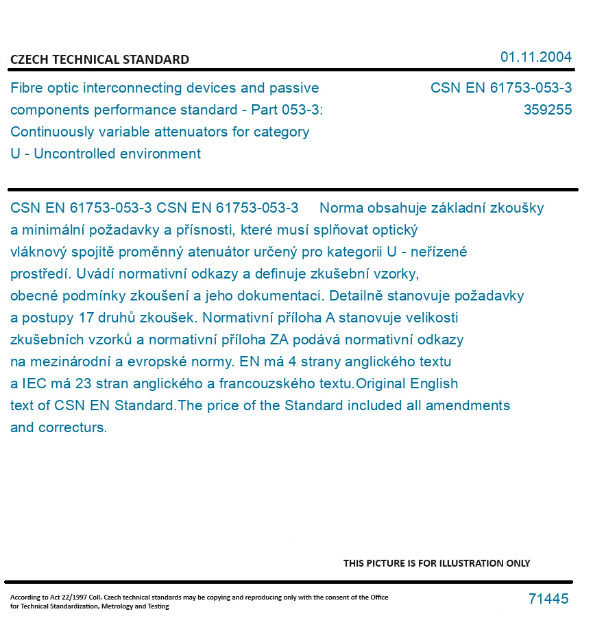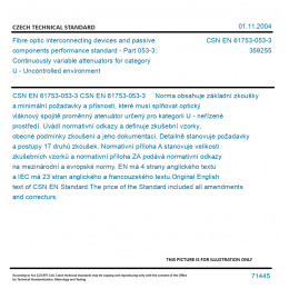 CSN EN 61753-053-3 Norma obsahuje základní zkoušky a minimální požadavky a přísnosti, které musí splňovat optický vláknový spojitě proměnný atenuátor určený pro kategorii U - neřízené prostředí. Uvádí normativní odkazy a definuje zkušební vzorky, obecné podmínky zkoušení a jeho dokumentaci. Detailně stanovuje požadavky a postupy 17 druhů zkoušek. Normativní příloha A stanovuje velikosti zkušebních vzorků a normativní příloha ZA podává normativní odkazy na mezinárodní a evropské normy. EN má 4 strany anglického textu a IEC má 23 stran anglického a francouzského textu. Original English text of CSN EN Standard. The price of the Standard included all amendments and correcturs.