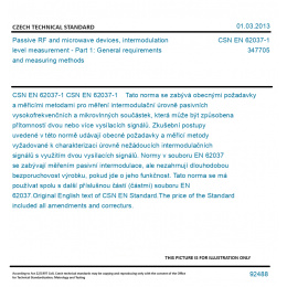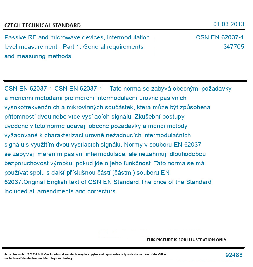 CSN EN 62037-1 Tato norma se zabývá obecnými požadavky a měřicími metodami pro měření intermodulační úrovně pasivních vysokofrekvenčních a mikrovlnných součástek, která může být způsobena přítomností dvou nebo více vysílacích signálů. Zkušební postupy uvedené v této normě udávají obecné požadavky a měřicí metody vyžadované k charakterizaci úrovně nežádoucích intermodulačních signálů s využitím dvou vysílacích signálů. Normy v souboru EN 62037 se zabývají měřením pasivní intermodulace, ale nezahrnují dlouhodobou bezporuchovost výrobku, pokud jde o jeho funkčnost. Tato norma se má používat spolu s další příslušnou částí (částmi) souboru EN 62037. Original English text of CSN EN Standard. The price of the Standard included all amendments and correcturs.