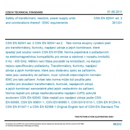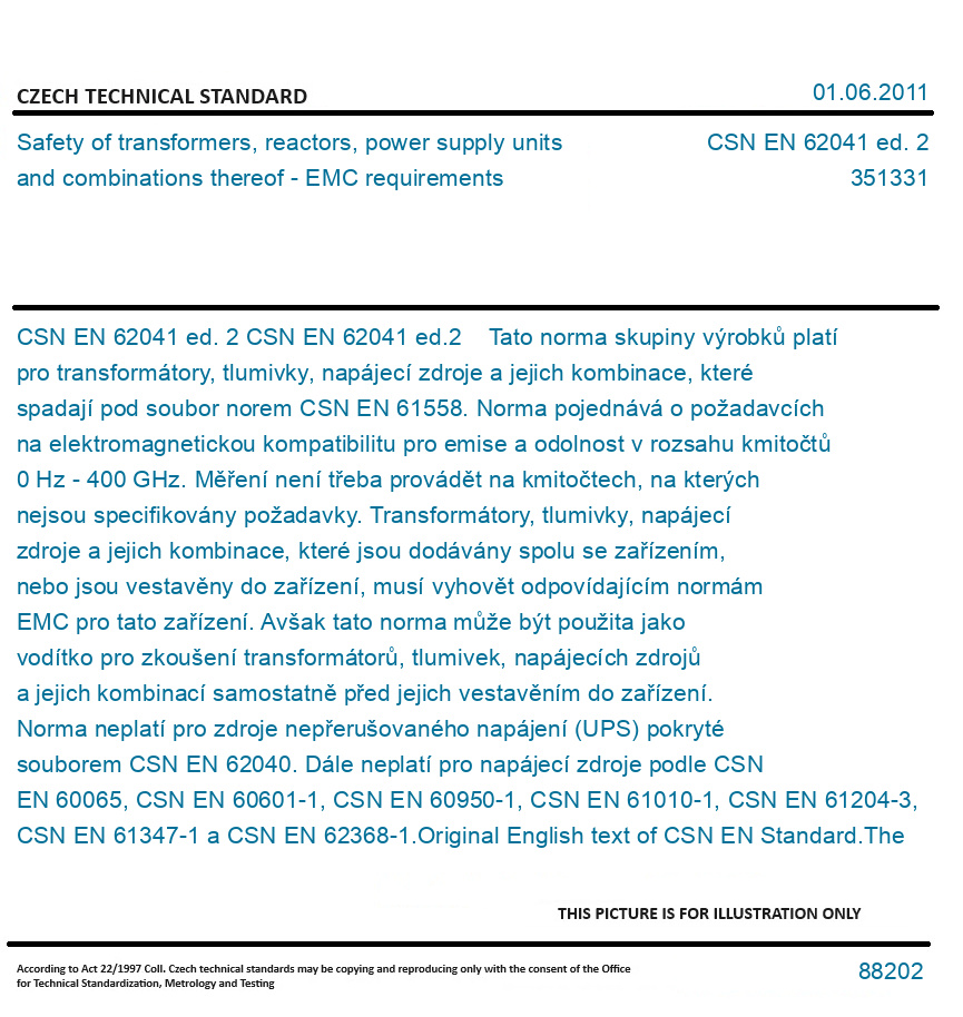 CSN EN 62041 ed.2 Tato norma skupiny výrobků platí pro transformátory, tlumivky, napájecí zdroje a jejich kombinace, které spadají pod soubor norem CSN EN 61558. Norma pojednává o požadavcích na elektromagnetickou kompatibilitu pro emise a odolnost v rozsahu kmitočtů 0 Hz - 400 GHz. Měření není třeba provádět na kmitočtech, na kterých nejsou specifikovány požadavky. Transformátory, tlumivky, napájecí zdroje a jejich kombinace, které jsou dodávány spolu se zařízením, nebo jsou vestavěny do zařízení, musí vyhovět odpovídajícím normám EMC pro tato zařízení. Avšak tato norma může být použita jako vodítko pro zkoušení transformátorů, tlumivek, napájecích zdrojů a jejich kombinací samostatně před jejich vestavěním do zařízení. Norma neplatí pro zdroje nepřerušovaného napájení (UPS) pokryté souborem CSN EN 62040. Dále neplatí pro napájecí zdroje podle CSN EN 60065, CSN EN 60601-1, CSN EN 60950-1, CSN EN 61010-1, CSN EN 61204-3, CSN EN 61347-1 a CSN EN 62368-1. Original English text of CSN EN Standard. The price of the Standard included all amendments and correcturs.