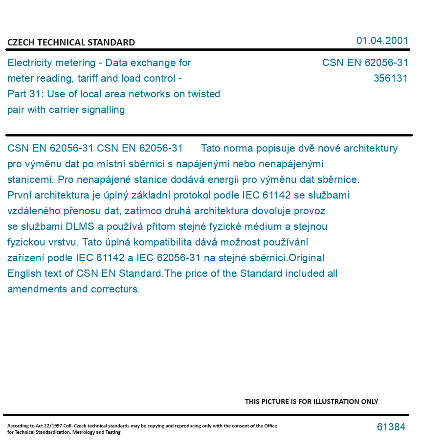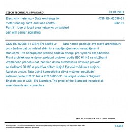 Number of Standard: CSN EN 62056-31 Category: 356131 Pages: 4 Released: 01.04.2001 Catalog number: 61384