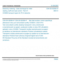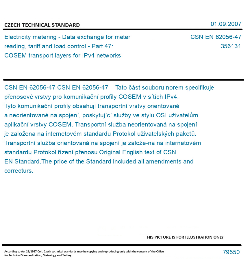 CSN EN 62056-47 Tato část souboru norem specifikuje přenosové vrstvy pro komunikační profily COSEM v sítích IPv4. Tyto komunikační profily obsahují transportní vrstvy orientované a neorientované na spojení, poskytující služby ve stylu OSI uživatelům aplikační vrstvy COSEM. Transportní služba neorientovaná na spojení je založena na internetovém standardu Protokol uživatelských paketů. Transportní služba orientovaná na spojení je založe-na na internetovém standardu Protokol řízení přenosu. Original English text of CSN EN Standard. The price of the Standard included all amendments and correcturs.