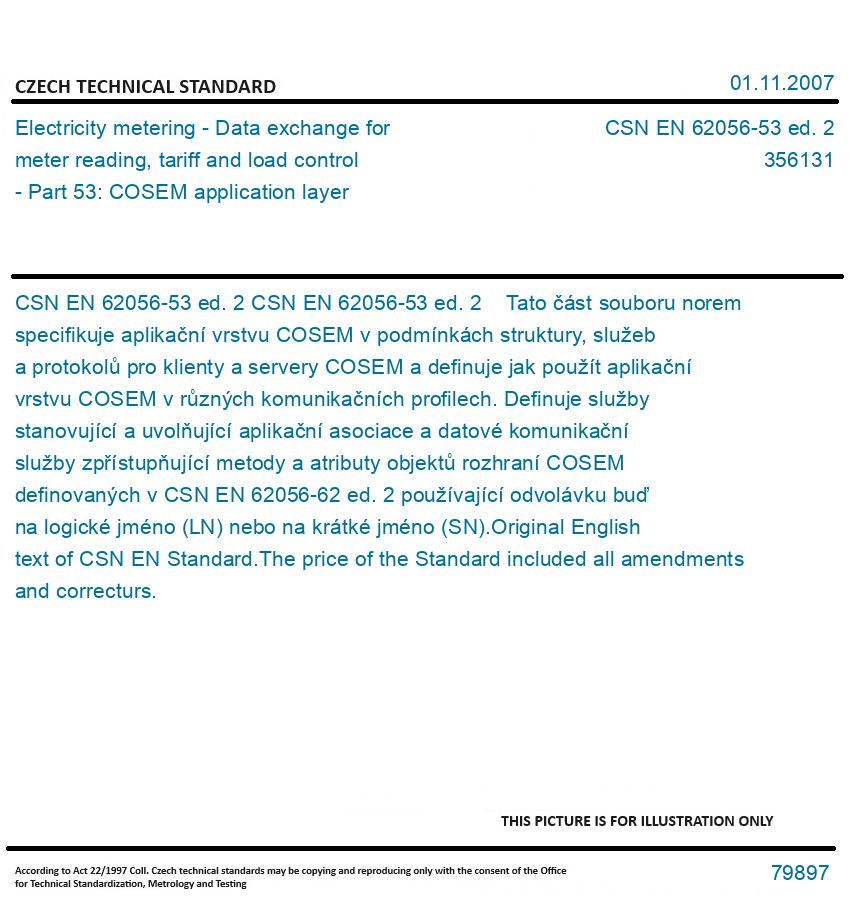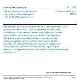 CSN EN 62056-53 ed. 2 Tato část souboru norem specifikuje aplikační vrstvu COSEM v podmínkách struktury, služeb a protokolů pro klienty a servery COSEM a definuje jak použít aplikační vrstvu COSEM v různých komunikačních profilech. Definuje služby stanovující a uvolňující aplikační asociace a datové komunikační služby zpřístupňující metody a atributy objektů rozhraní COSEM definovaných v CSN EN 62056-62 ed. 2 používající odvolávku buď na logické jméno (LN) nebo na krátké jméno (SN). Original English text of CSN EN Standard. The price of the Standard included all amendments and correcturs.